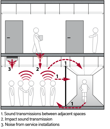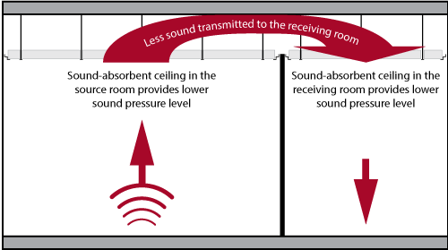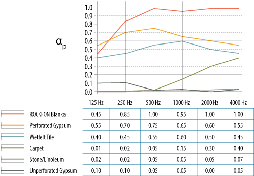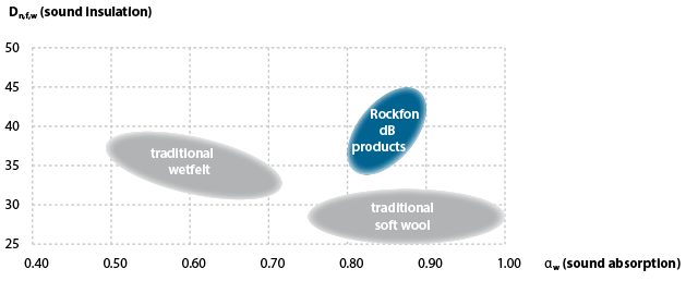 Rockfon-kivivillatuotteiden äänenvaimennuskyky on korkeampi moniin muihin materiaaleihin verrattuna.