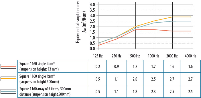 Saarekkeiden ja melunvaimentimien äänenvaimennuskyky ilmoitetaan vastaavana äänenvaimennuspinta-alana Aeq ilmaistuna neliömetreinä yksikköä kohden. Aeq-arvo lasketaan ISO 354 -standardin mukaisesti. Tämä ilmaisee kuvitteellisen vaimentavan pinta-alan αw = 1,00, joka vaimentaisi ääntä yhtä paljon kuin testattu saareke tai melunvaimennin. Vastaavaa standardisoitua ”painotettua” äänenvaimennuspinta-alaa ei ole. Paras tapa verrata paljasta alakattoa saarekkeilla tai melunvaimentimilla varustettuun alakattoon onkin laskea jälkikaiunta-ajat huone- ja tilannekohtaisesti.